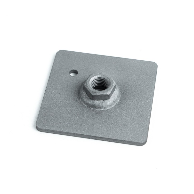 The plate is made of 3 mm thick steel (S355) and a nut with a 7/16" UNF thread that fits the eyebolts attached to the seat belts.