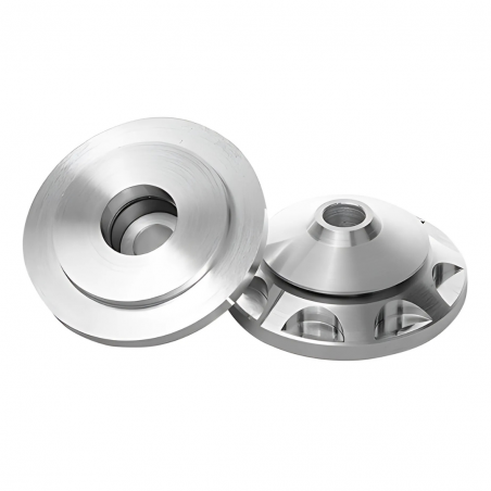 The spring plates are manufactured with milling methods from duralumin 2017a with the bearing. They are used for screw suspension in case of the application of cambers. They provide trouble-free operation of the suspension upper fastening. May be used in various cars with the screw M14 in the upper part of the shock absorber and the spring with inner/outer diameters 65, 80 mm