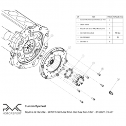 Custom aluminium flywheel 240mm / 9.45" with interchangeable friction disc (FW001.00.02 spare part available on the website) - adapted for BMW M57 or BMW E46 M3 pressure plate (not compatible with M50 / M52 / M54 / S50 / e36 M3). Each PMC Motorsport flywheel is checked and balanced before shipment, the kit includes all necessary mounting bolts.