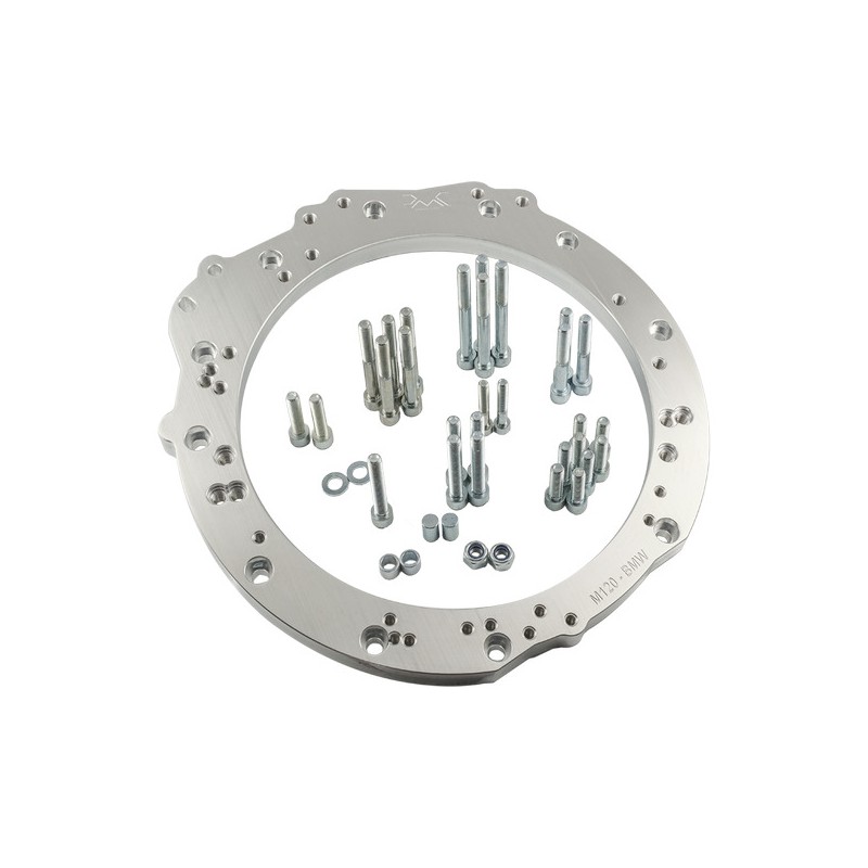 Aluminium adapter enabling the connection (mate / SWAP / conversion) of Mercedes-Benz V12 M120 with manual or automatic ZF (ZF Friedrichshafen) / Getrag transmissions from BMW. The adapter supports both popular manual transmissions such as ZF 5, GS5-39DZ, GS6-53DZ/BZ, and Getrag 420G, as well as modern ZF 8HP automatic or Getrag DCT DKG dual-clutch transmissions. It's the most universal kit available on the market.