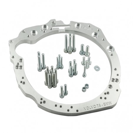 Aluminium adapter enabling the connection (mate / SWAP / conversion) of Volvo Modular Whiteblock "White" T5 T6 with manual or automatic ZF (ZF Friedrichshafen) / Getrag transmissions from BMW. The adapter supports both popular manual transmissions such as ZF 5, GS5-39DZ, GS6-53DZ/BZ, and Getrag 420G, as well as modern ZF 8HP automatic or Getrag DCT DKG dual-clutch transmissions. It's the most universal kit available on the market.