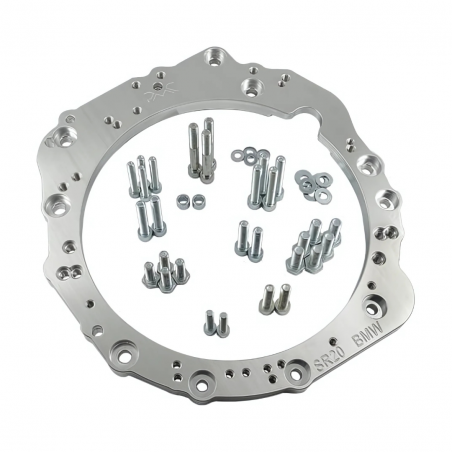 Aluminium adapter enabling the connection (mate / SWAP / conversion) of Nissan SR SR20 with manual or automatic ZF (ZF Friedrichshafen) / Getrag transmissions from BMW. The adapter supports both popular manual transmissions such as ZF 5, GS5-39DZ, GS6-53DZ/BZ, and Getrag 420G, as well as modern ZF 8HP automatic or Getrag DCT DKG dual-clutch transmissions. It's the most universal kit available on the market.