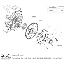 Custom aluminium flywheel 240mm / 9.45" with interchangeable friction disc (FW001.00.02 spare part available on the website) - adapted for BMW M57 / M57n / N54 or BMW E46 M3 pressure plate (not compatible with M50 / M52 / M54 / S50 / e36 M3). Each PMC Motorsport flywheel is checked and balanced before shipment, the kit includes all necessary mounting bolts.