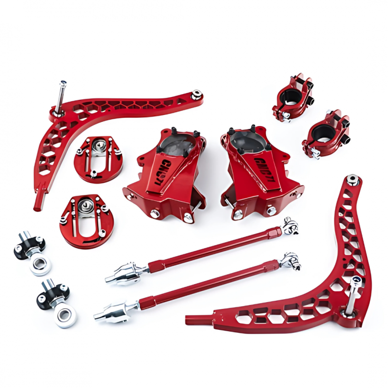 The product is manufactured from high-quality steel and aluminium using precise CNC machinery. The kit includes lower control arms, steering rack spacers, upper damper mounts, knuckles with all necessary hardware, and an installation manual.